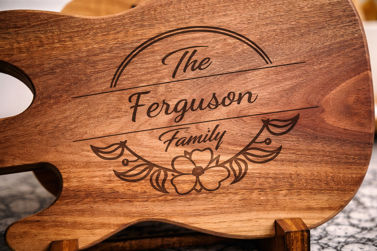 Handcrafted guitar-shaped cutting board featuring precision laser engraving of your family name. This single-piece design combines functionality with personalized artistry, making it an ideal gift for music enthusiasts or a striking addition to any kitchen. The engraved nameplate adds a custom touch that celebrates your family's identity while serving as a practical prep surface or display piece.