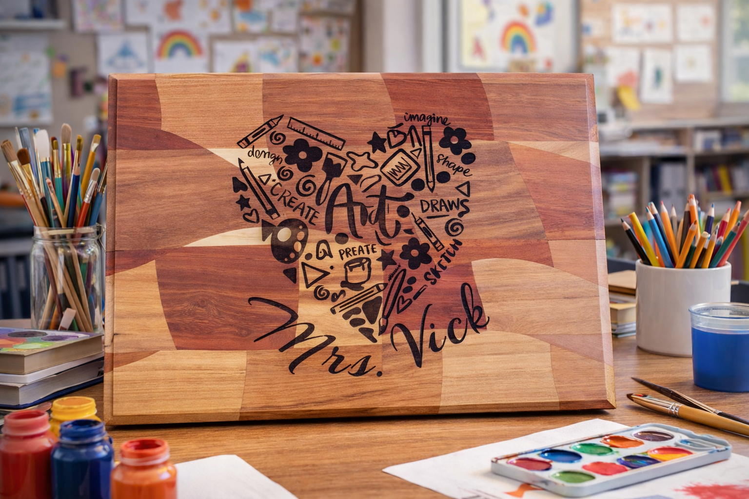 Handcrafted cutting boards featuring four distinct wood species arranged in striking abstract patterns. Each board is personalized for individual teachers, making them ideal for coordinated group gifting. Perfect for recognizing multiple educators with a cohesive yet unique presentation. These boards combine functional kitchen utility with artisanal craftsmanship, offering a memorable gift that celebrates teaching excellence across your school or organization.